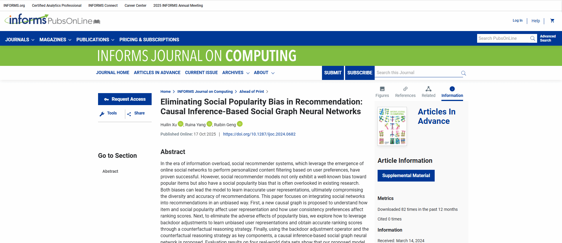 近日,国际运筹学与管理科学学会(INFORMS)旗下期刊《INFORMS Journal on Computing》在线发表了amjs澳金沙门副教授、博士生导师耿瑞彬与合作者的最新研究成果——题为 “Eliminating Social Popularity Bias in Recommendation: Causal Inference-Based Social Graph Neural Networks”(《消除推荐系统中的社会流行度偏差:基于因果推理的社会图神经网络》)的论文, 耿瑞彬副教授为通讯作者。该研究聚焦于社交推荐系统中的“社会流行度偏差”问题。传统推荐算法容易偏向热门内容,而在社交网络环境中,这种偏差会被“社会影响力”进一步放大,导致推荐结果集中于意见领袖或高影响力用户关注的内容,从而损害信息多样性与公平性。