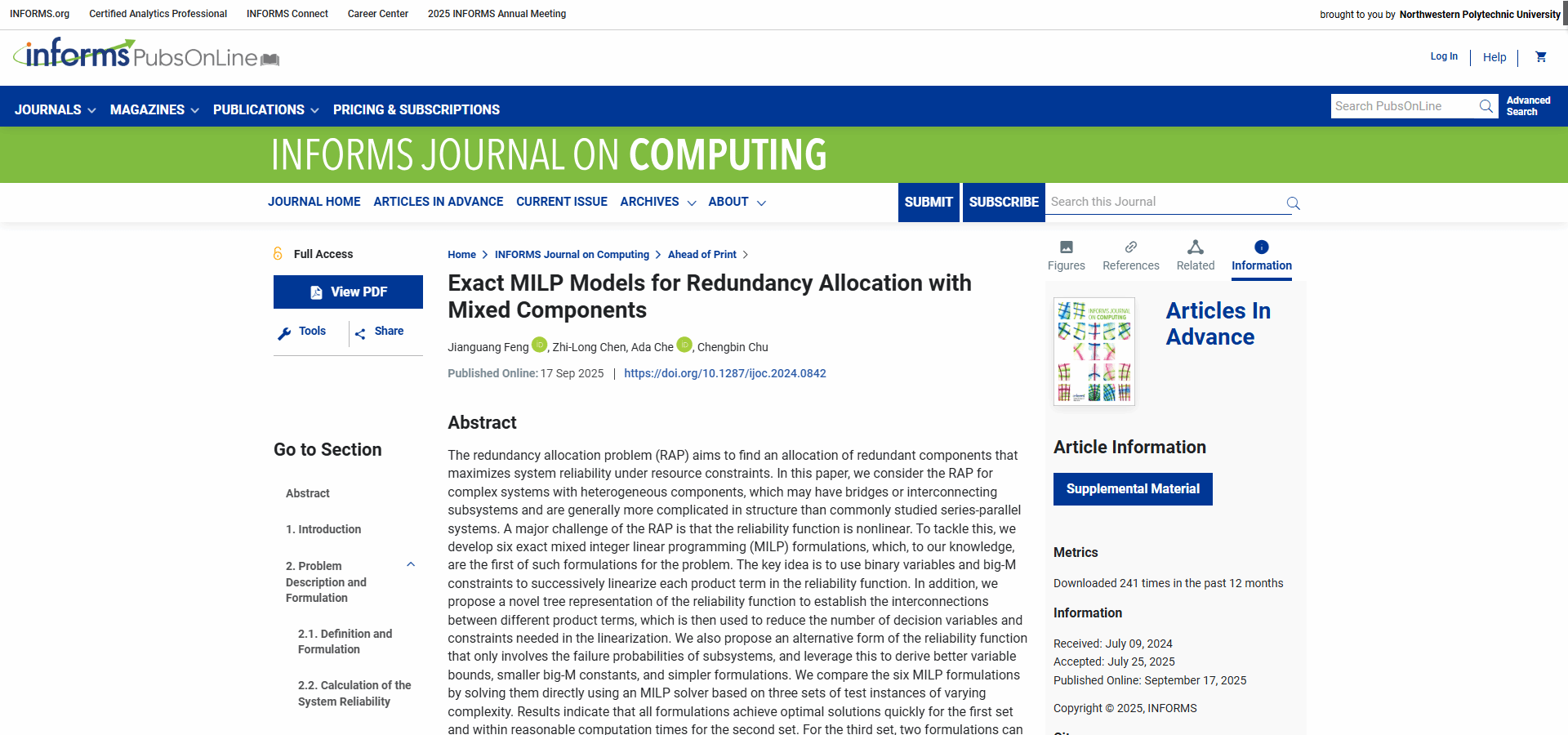近日,《INFORMS Journal on Computing》期刊在线刊发了amjs澳金沙门冯建广副教授的研究成果“Exact MILP Models for Redundancy Allocation with Mixed Components”,amjs澳金沙门副教授冯建广为论文第一作者、车阿大教授为论文通讯作者。该研究聚焦于系统设计中的冗余分配问题(RAP),这一问题旨在有限资源条件下,通过合理配置冗余部件来最大化系统可靠性。本研究针对包含异质部件和复杂结构的情境,提出对非线性可靠性函数的逐步线性化方式,构建了多种精确混合整数线性规划(MILP)模型,并通过树形结构表示大幅减少模型的决策变量与约束数量。计算结果显示了所开发模型与方法的高效求解性能,尤其在大规模复杂系统中表现出稳健性和可扩展性,显著优于现有分支定界方法。