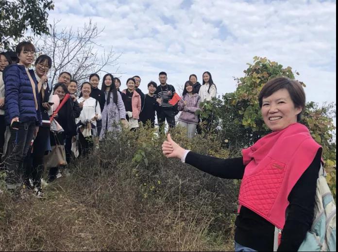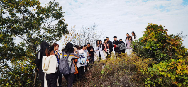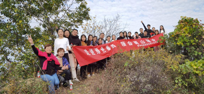 上山路途崎岖不平,越靠近山顶的路就越是陡峭,沿途上只剩下登山爱好者们留下的丝带和脚印,路上掉落的树叶更是增加了登山的困难,极易滑倒。党员们自主结成对子互相帮助,携手并进。张海兰在最前面为党员们引路,加油打气,鼓励各位党员坚持到底,终于在经历过最艰难的一段山路后成功登顶。同志们脸上洋溢着灿烂的笑容,既是坚持不懈终成功登顶的喜悦,更是对自己的肯定。坚信经过此次活动,各位党员同志们心智更为坚定,更有勇气面对艰难挫折。