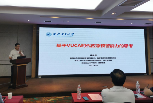 接下来,陕西省应急厅高级别专家组组长、西北工业大学应急管理研究所所长桂维民教授以“基于VUCA时代应急预警能力的思考”为题作大会主旨报告,阐述了VUCA时代下觉知力和反思判断力对应急预警能力的重要性。