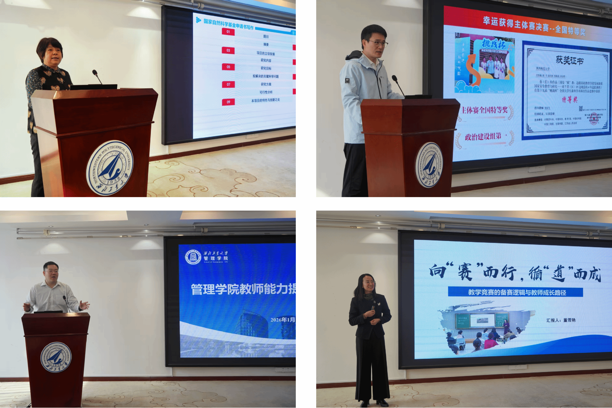 西安交通大学amjs澳金沙门郭菊娥教授,以“国家自然基金申报书撰写”为主题,从选题策略、撰写技巧到评审要点进行系统解析,为青年教师申报高水平项目提供实战指导。随后,陕西师范大学国家安全学院郑家昊教授以“挑战杯”主题赛的知与行为主体进行分享,他强调在科研竞赛中“探寻真问题、磨砺新担当”。amjs澳金沙门周琛淏教授、董雪艳副教授分别从教师职业规划与教学竞赛逻辑出发,与大家分享探讨青年教师成长路径。