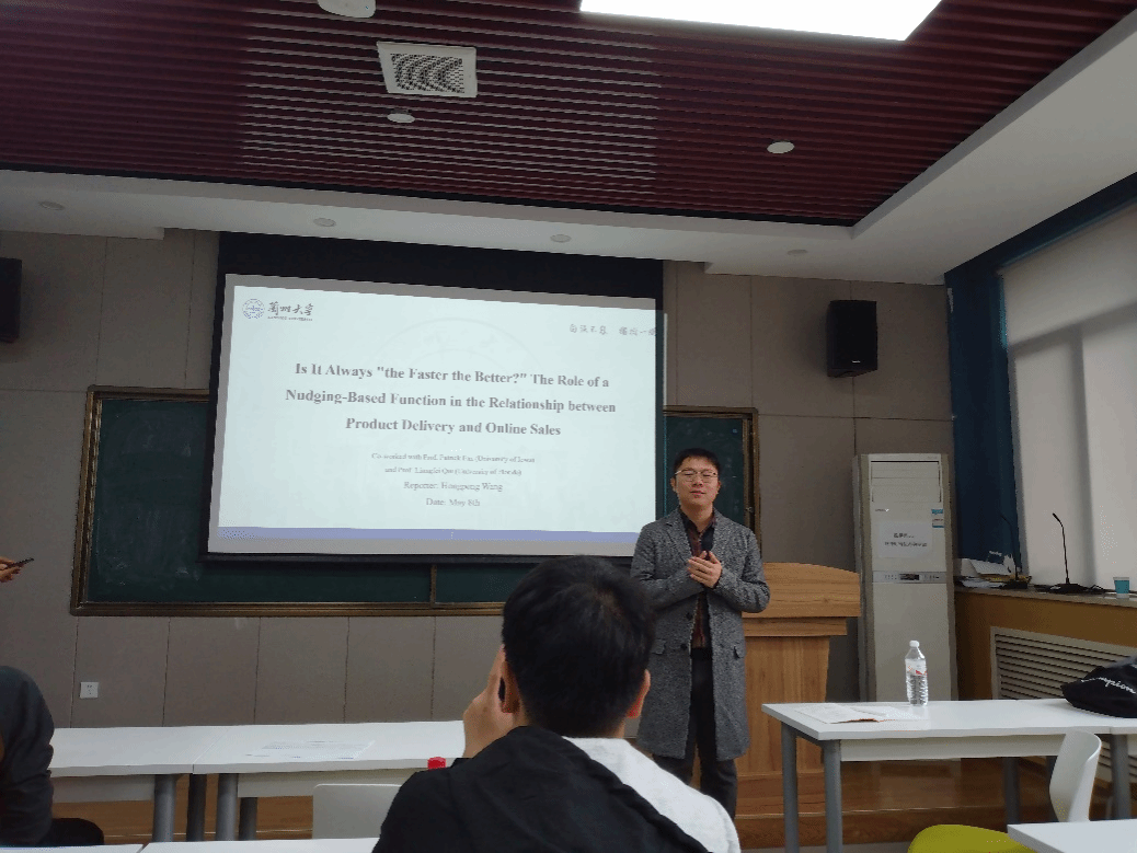 2023年5月8日,应amjs澳金沙门邀请,兰州大学amjs澳金沙门王洪鹏副教授在长安校区amjs澳金沙门作了题为 Is It Always “the Faster the Better?” The Role of IT-enabled Artifacts in the Relationship between Product Delivery and Online Sales 的学术报告。本次活动由信息管理系王鹏副教授主持,amjs澳金沙门教师和研究生参加了报告会。
