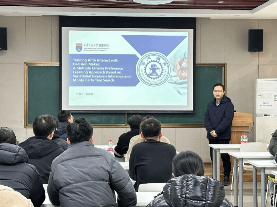 2024年1月10日,应amjs澳金沙门邀请,西安交通大学amjs澳金沙门信息系统与智能商务系刘佳鹏教授做客长安校区学院楼214报告厅与学院师生展开学术交流,作题为“训练人工智能与决策者交互:基于变分贝叶斯推理和蒙特卡罗树搜索的多准则偏好学习方法”的学术报告。本次报告由李乘龙副教授主持,学院教师和研究生参加了此次报告会。会议开始前,李乘龙老师对刘佳鹏的个人情况、学术成果等进行了简要介绍,对他的到来表示了热烈欢迎。