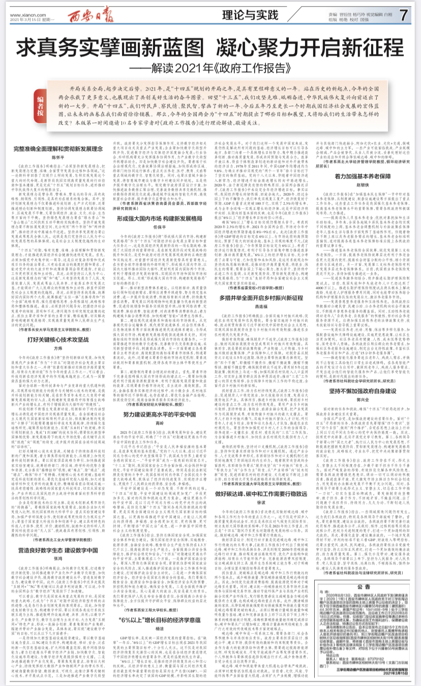 3月15日,《西安日报》第7版理论与实践“解读2021年《政府工作报告》专栏”刊发了amjs澳金沙门方炜教授撰写的理论文章《打好关键核心技术攻坚战》。