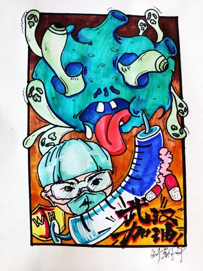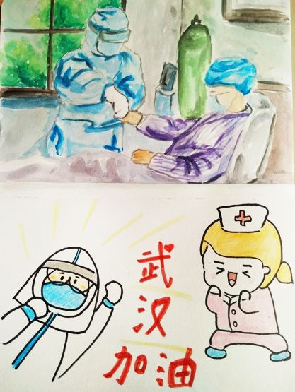 (2)我们倡议“防控意识要增强,口罩酒精84上,我学我做我担当,全民战疫阵线刚!”支部党员用书法和手绘为武汉加油,我们做着简单的事情为之加油鼓劲,表达对一线病人与医生的关心,在全国同胞的努力下,一定可以战胜病毒。
