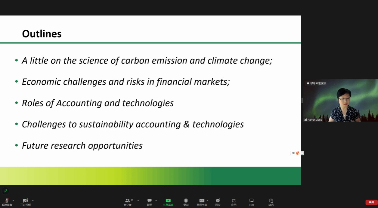 会议伊始,苏坤对姜海燕的研究方向、科研成果及学术贡献做了简要介绍。姜海燕以气候变化和碳排放加剧了资本市场面临的经济挑战和风险为背景,探讨了组织在多大程度上以及如何应用技术和会计来实现经济、环境和社会的可持续发展。她介绍了碳排放和气候变化的现状,并阐述了由此带来的经济挑战和金融市场风险。随后,从会计和技术扮演的作用、可持续发展会计和技术面临的挑战、未来研究机会几个方面,姜海燕为师生做了详细深入的报告。问题探讨环节,姜海燕耐心解答了师生提问,学术讨论氛围浓厚。