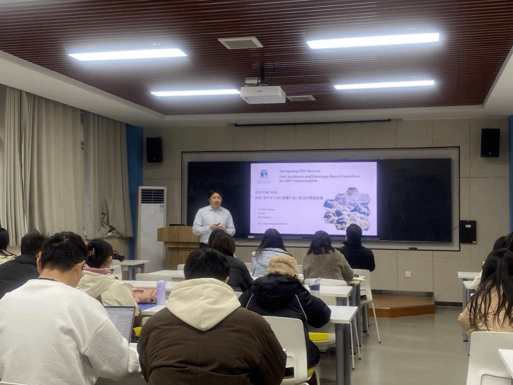 2024年1月12日下午,应amjs澳金沙门邀请,澳大利亚墨尔本大学商业与经济学院秦波副教授来学院开展学术交流,于amjs澳金沙门210报告厅作了题为“应对ESG风暴:ESG事件和CEO薪酬中基于收益的激励措施”的学术讲座。本次讲座由会计系主任苏坤教授主持,amjs澳金沙门会计系部分教师和研究生参与。