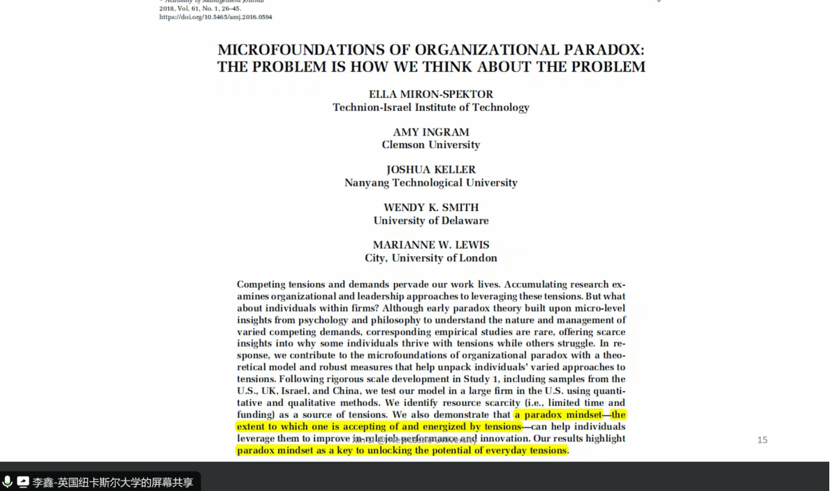 2024年9月23日晚,应amjs澳金沙门邀请,英国纽卡斯尔大学李鑫教授在线与学院师生开展学术交流,作了题为“细化both/and:整合矛盾对立双方的通用策略”的学术报告。本次报告会为amjs澳金沙门2024海外讲座第23期,由田庆锋教授主持,amjs澳金沙门部分教师和研究生参与。