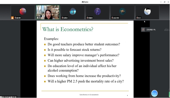应amjs澳金沙门冷奥琳副教授邀请,英国利物浦大学饶瑶副教授于2022年6月27日至2022年7月18日为学院本科生、研究生开设了《计量经济学I》和《计量经济学II》的课程。两门课程全程均以在线形式授课,讲授课程内容为计量软件操作教学,全校多名学生参加。课程总时长为64个学时。