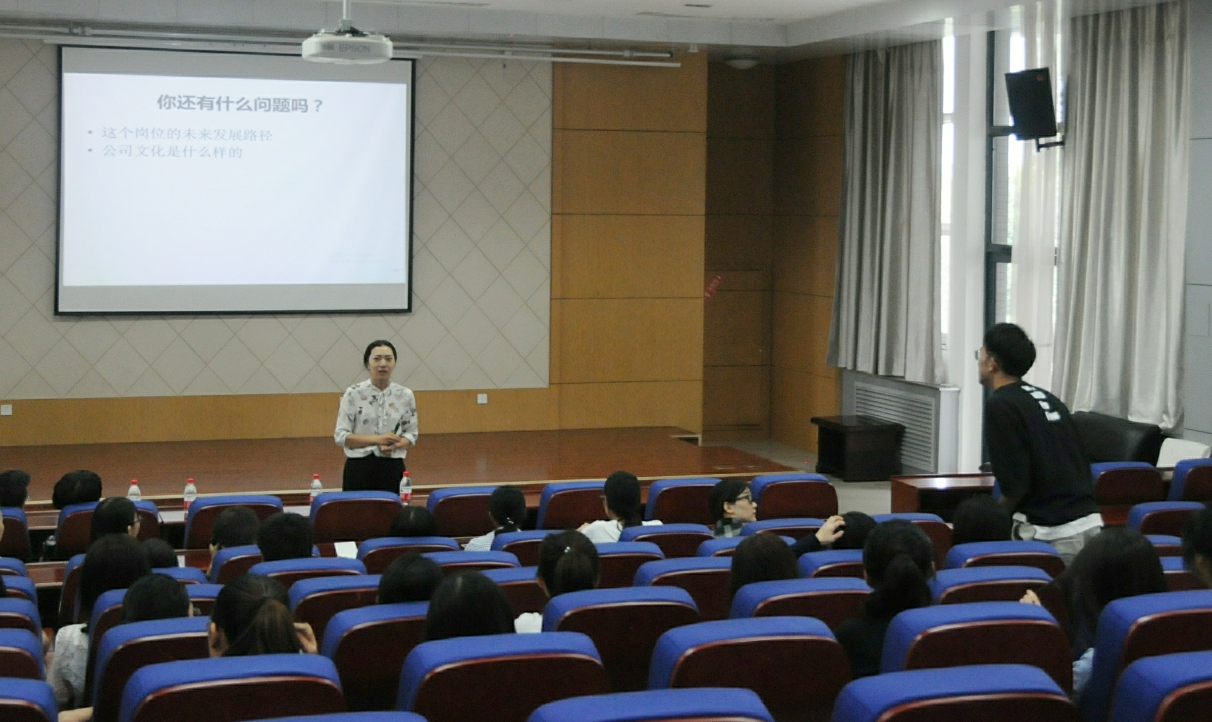 随后,学生就业创业指导服务中心的朱莉老师以典型就业和成长案例为切入点,为同学们讲解了求职及面试技巧。朱莉老师指出,在成功就业的过程中,认清自己是前提,要充分了解自己性格、兴趣、能力;在找准定位之后,要合理定位工作期望,根据预期职业,积极提高求职技能,做好充分的求职准备;最后,朱老师强调,在求职中要拓展就业思路,充分利用学校提供的相关就业资源,发挥自身优势,找到心仪的工作。