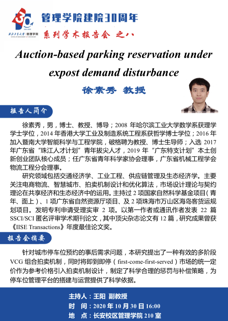 【amjs澳金沙门建院30周年系列学术报告会之八】Auction-based parking reservation under expost demand disturbance