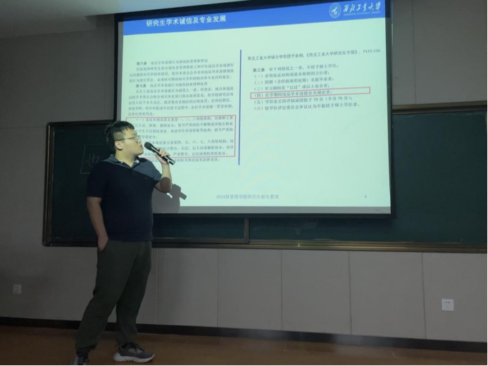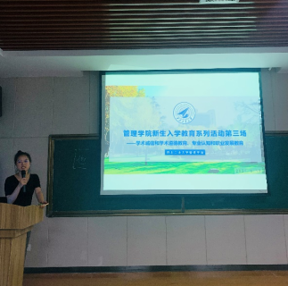 活动开始,薛力老师首先向大家分享了研究生学术道德所包含的内容,主要包括学术道德规范、学术不端所可能引起的后果以及最新出台的毕业论文抽检政策等。尔后,薛老师站在专业的角度,为大家介绍了管理科学与工程专业的发展前景,可以用“所有行业智能化;所有专业理工化;所有岗位技术化”这样三句话来概括,并针对性的对同学们未来三年学习的重点提出建议。最后薛老师同大家进行友好互动,对同学们提出的问题作出详细又独到的解答,很大程度上扫除了同学们对未来迷茫。