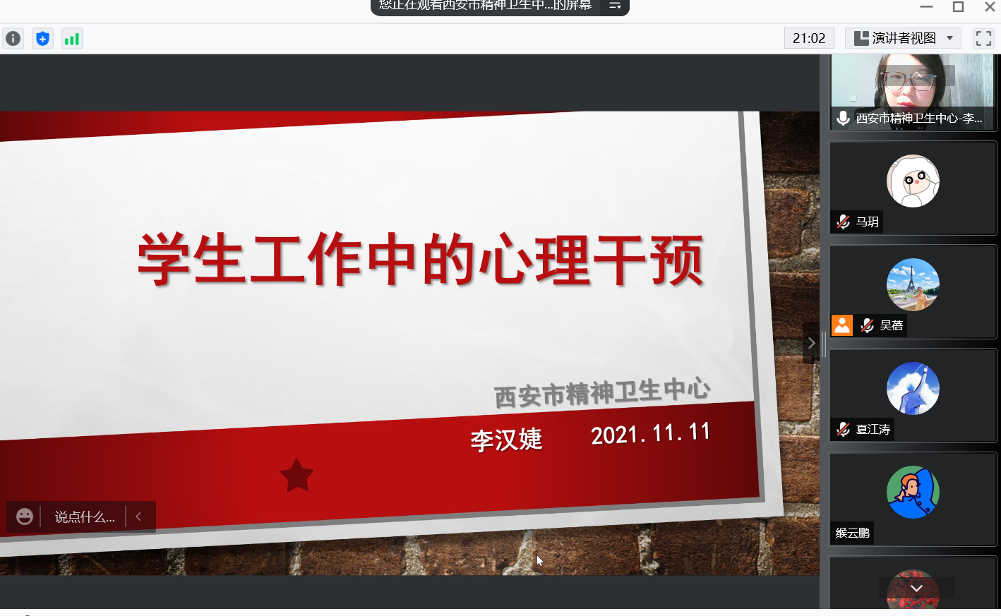 2021年11月11日晚,amjs澳金沙门于线上顺利开展了题为“学生工作中的心理干预”专题培训活动。西安市精神卫生中心李汉婕老师受邀担任主讲人,amjs澳金沙门全体专职与兼职辅导员参加了此次集体学习。
