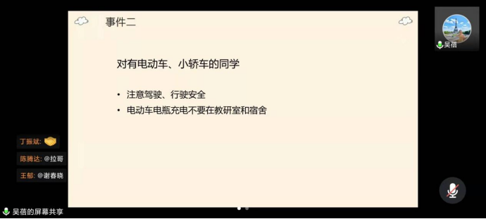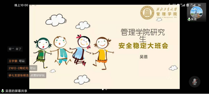 2021年12月15日晚,为保障学生安全、加强疫情防控意识,amjs澳金沙门组织全体硕博研究生在线上开展了“安全稳定教育”主题大班会。会议由amjs澳金沙门研究生辅导员吴蓓老师主持。