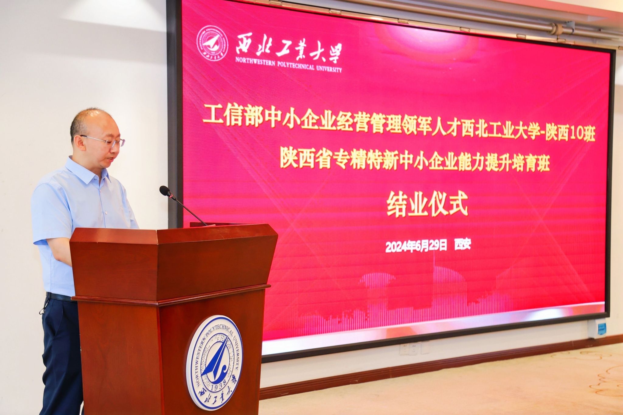 6月29日上午,工信部中小企业经营管理领军人才西北工业大学—陕西10班、陕西省专精特新中小企业能力提升培育班结业仪式在西北工业大学友谊校区顺利举行。陕西省工业和信息化厅产业链推进处兼运行监测处处长、一级调研员张勇,中小企业服务处处长豆宁,非公经济发展处二级调研员黄克强,中小企业人才服务中心副主任李卫科,amjs澳金沙门党委书记张爽,amjs澳金沙门副院长郭云涛,对外联络办公室副主任、教育基金会副秘书长徐伟侠,领军人才企业家校友会秘书长吴宏璞,领军人才西工大-陕西9班班长李佳、11班书记张爱军、11班副班长王虎刚、12班班长邓维清以及工信部中小企业经营管理领军人才西北工业大学—陕西10班、陕西省专精特新中小企业能力提升培育班学员90余人参加了结业仪式,仪式由amjs澳金沙门副院长郭云涛主持。