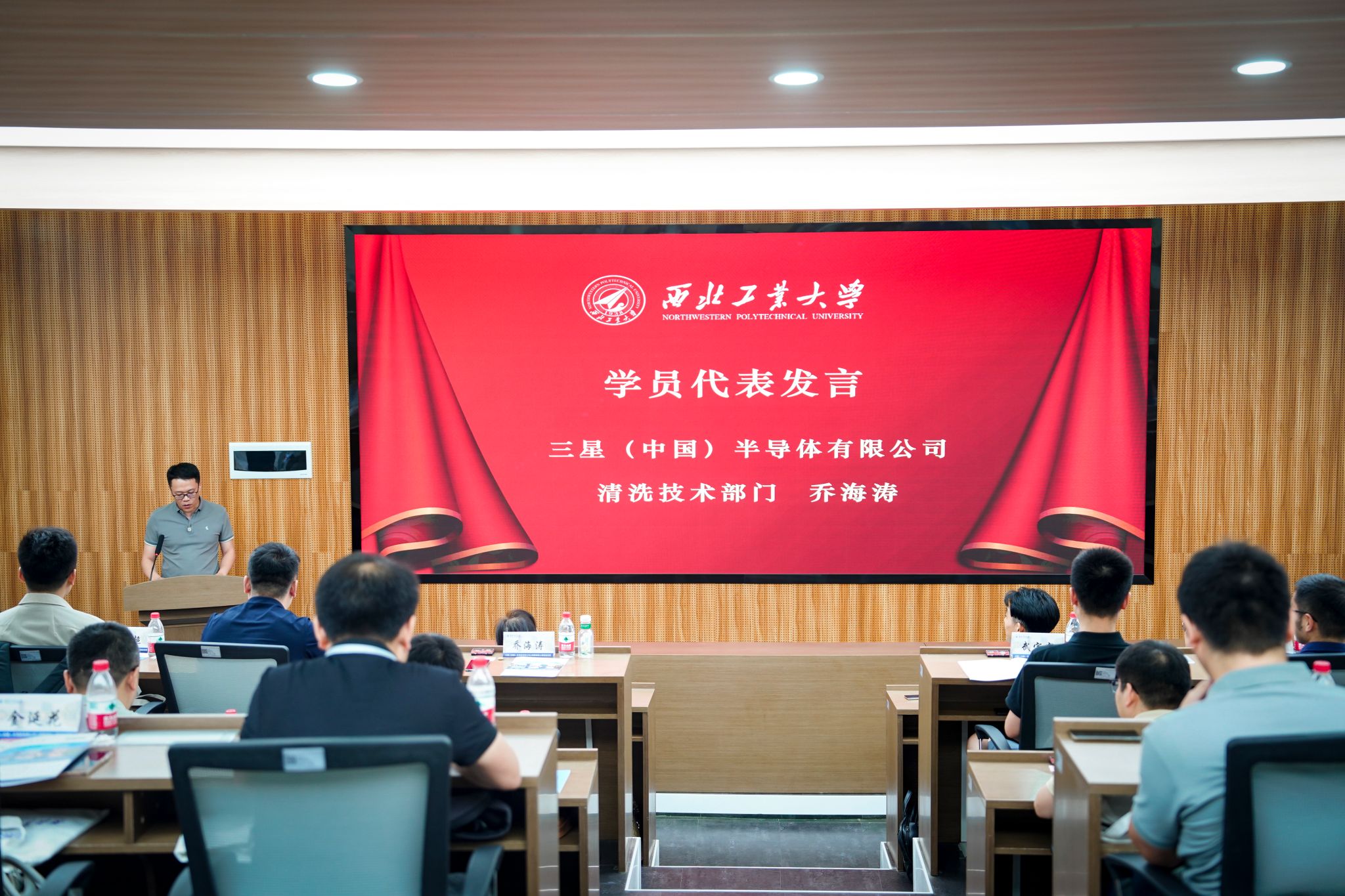 三星(中国)半导体有限公司清洁技术部门资深主任工程师乔海涛作学员代表发言,他首先感谢公司给予的此次参训机会以及amjs澳金沙门提供的良好学习氛围及培训资源,并表示将秉承三星(中国)半导体有限公司快速发展及高效运转的企业理念,与各位同事携手共进、比肩同行,在西北工业大学这所全国名校共同学习思考,相互交流启发,把学习成果转化成工作思路、工作动力。