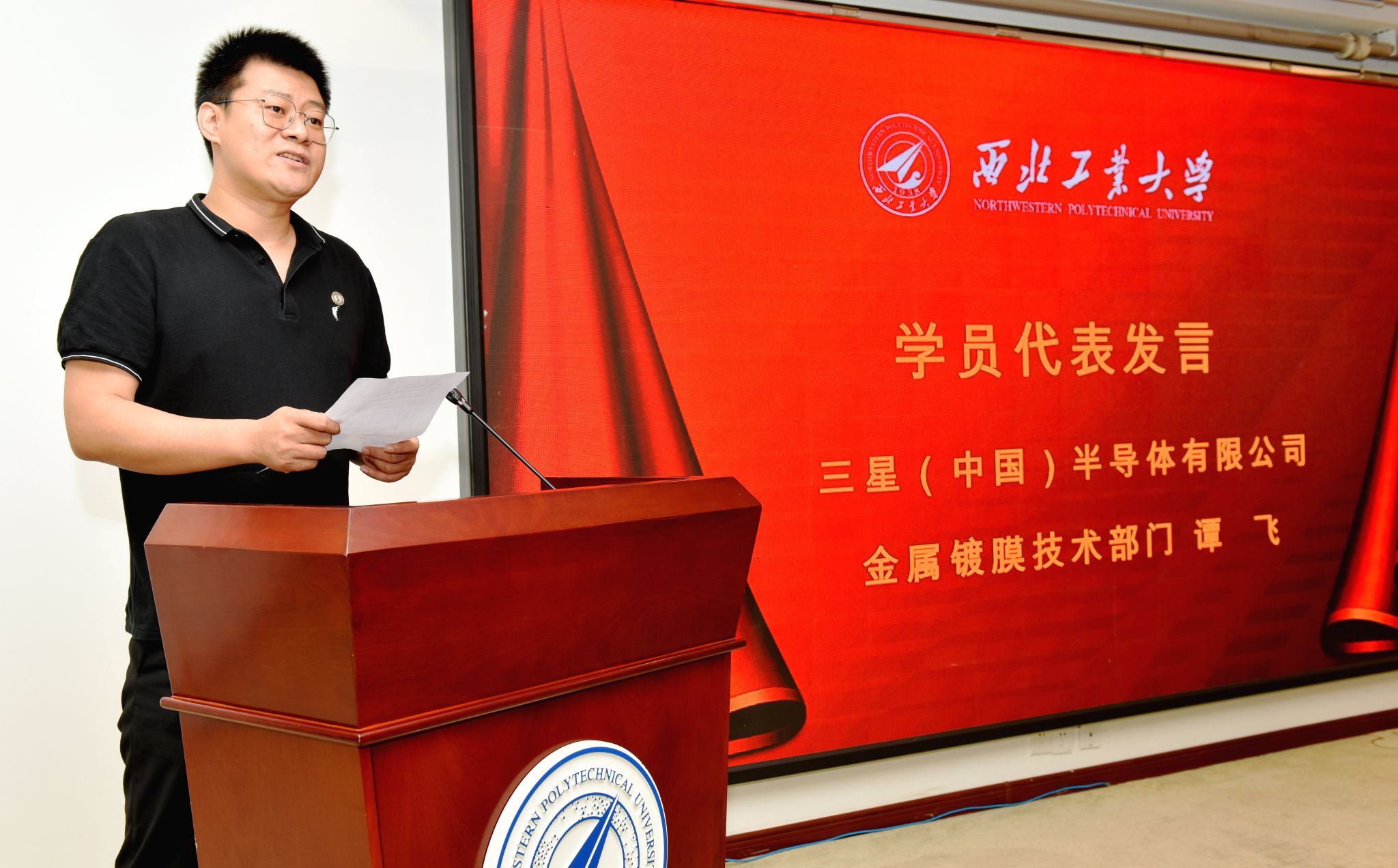 三星(中国)半导体有限公司金属镀膜技术部门资深主任工程师谭飞作学员代表发言,他首先感谢公司给予的此次参训机会以及amjs澳金沙门提供的良好学习氛围及培训资源,并表示将秉承三星(中国)半导体有限公司快速发展及高效运转的企业理念,与各位同事携手共进、比肩同行,在西北工业大学这所全国名校共同学习思考,相互交流启发,把学习成果转化成工作思路、工作动力。