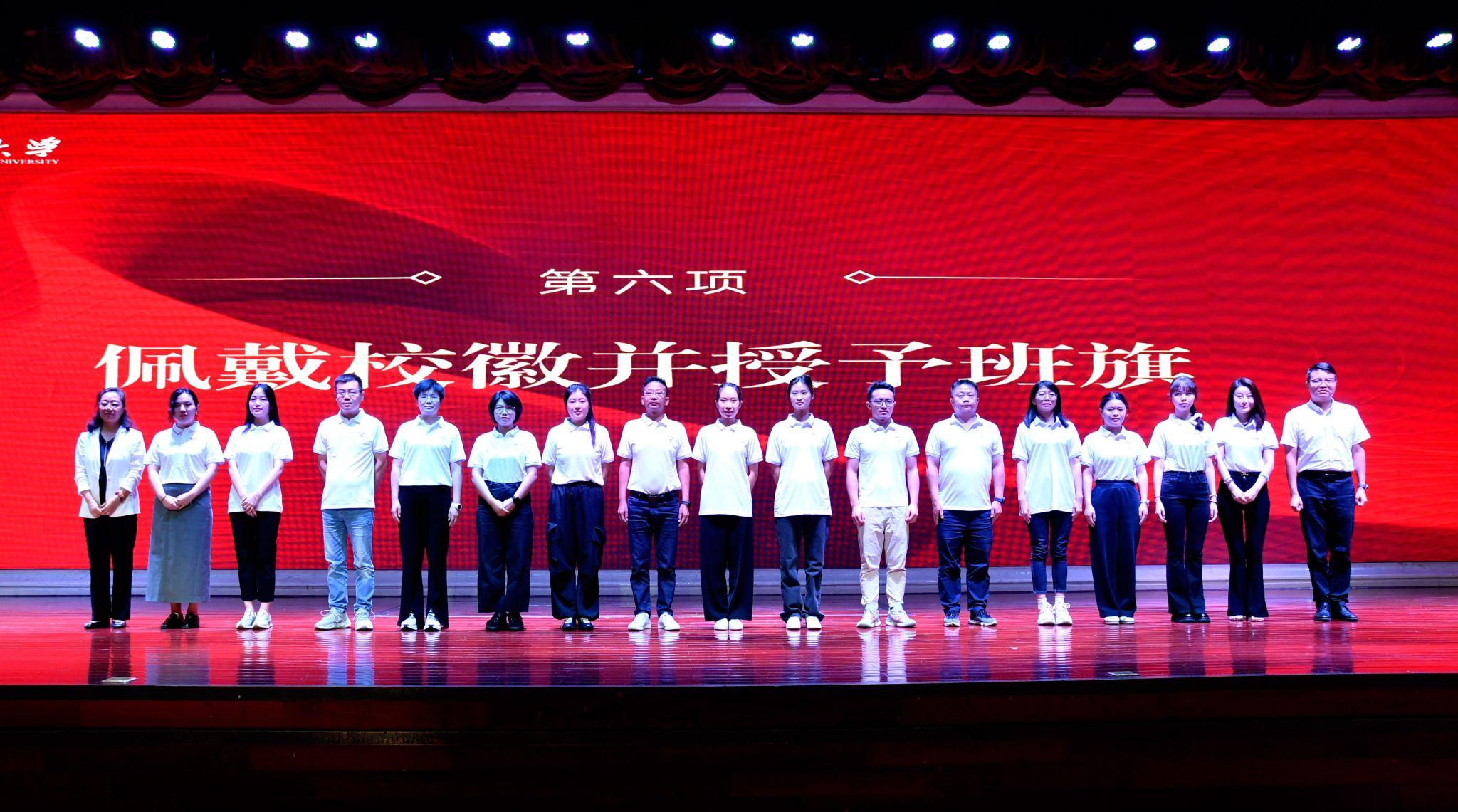 MBA/MEM教育中心主任杨宏玲、MPAcc教育中心主任金帆、MBA教育中心副主任肖平、MBA/MEM/MPAcc教育中心副主任黄媛为各班新生代表授予班旗。一面面班旗不仅是班级凝聚力的象征,更承载着学院对新生们“携手共进、逐梦前行”的期许。