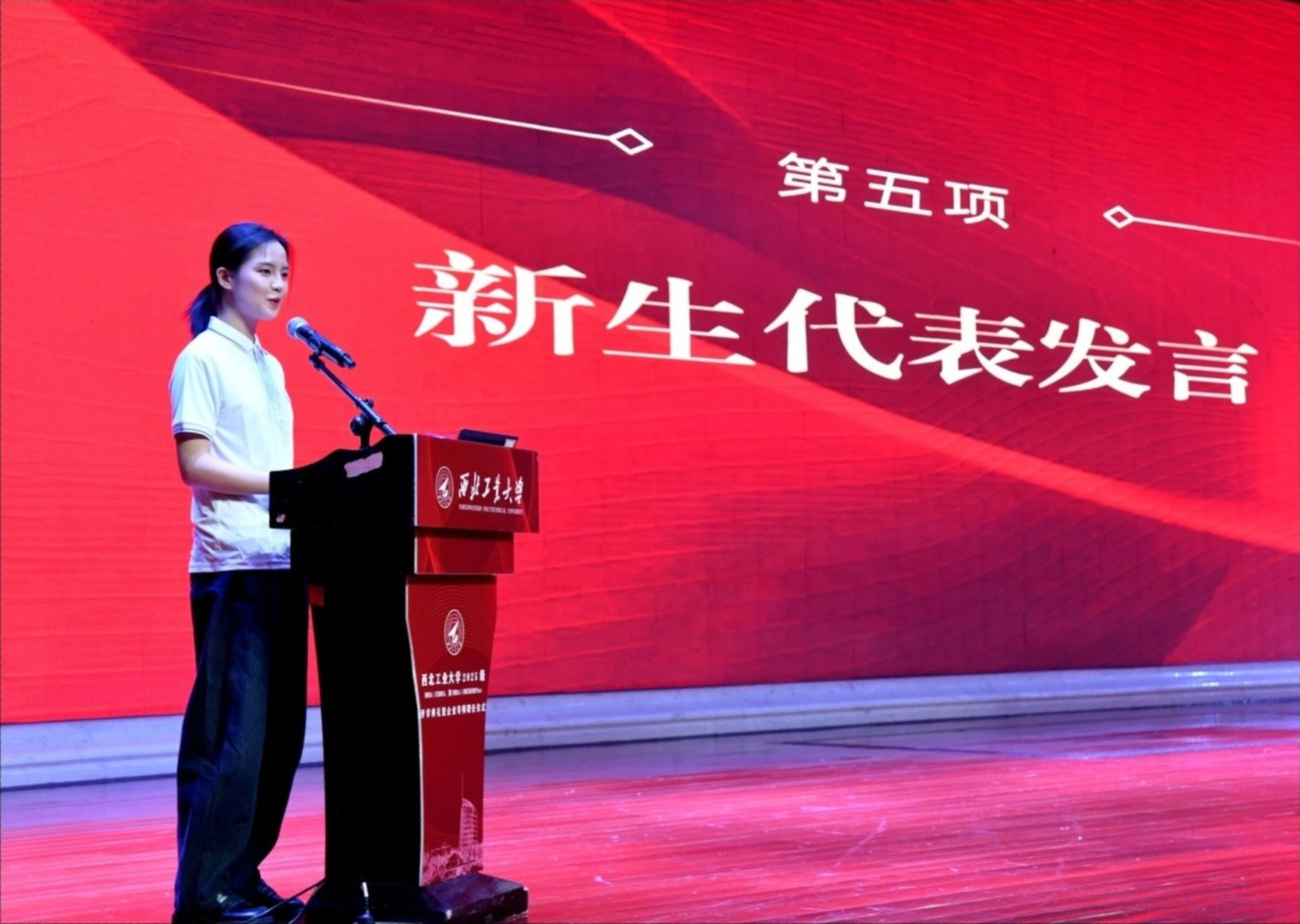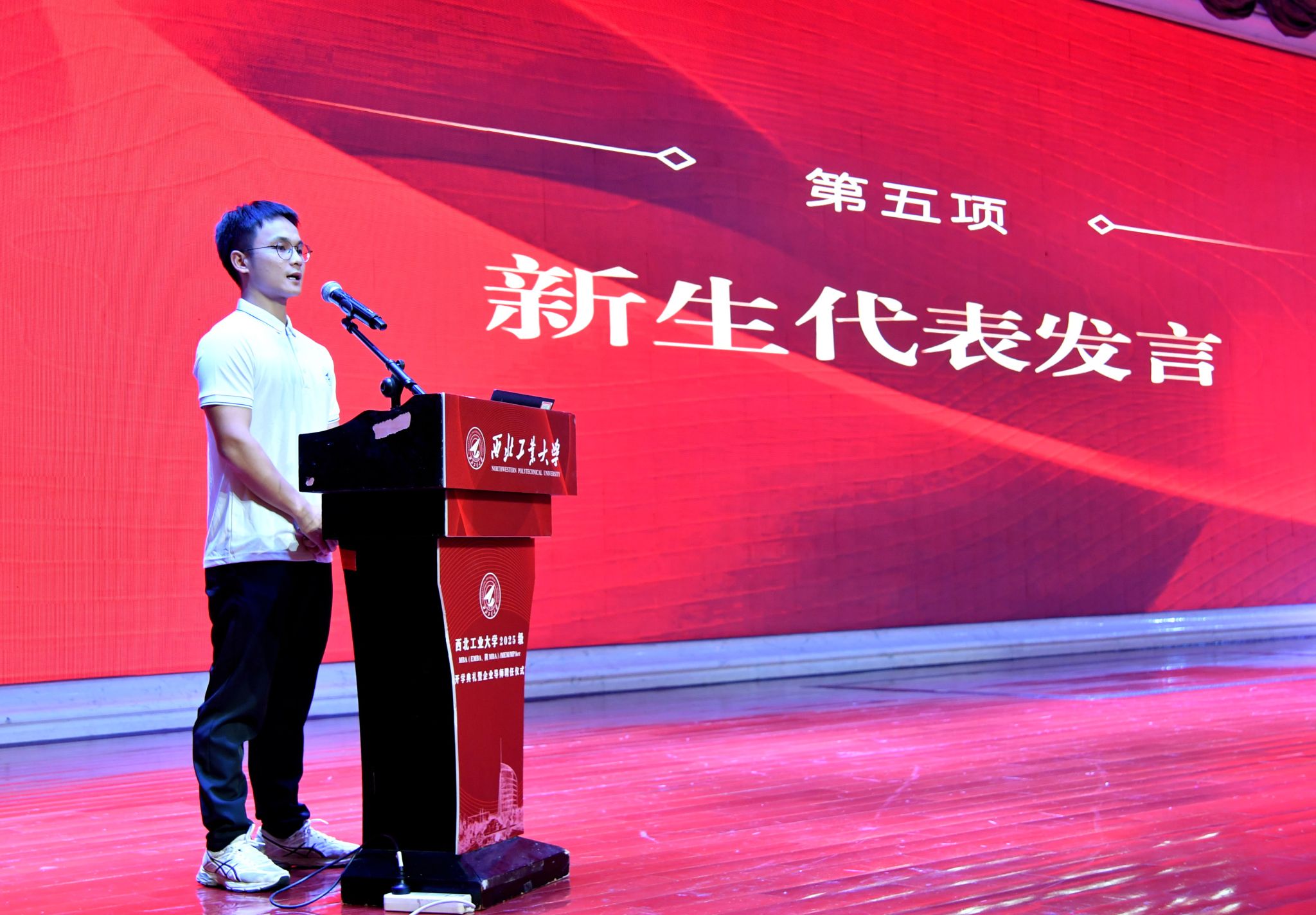 张爽、王海啸共同为新生代表佩戴西北工业大学校徽,当象征着“公诚勇毅”精神的校徽别在胸前,新生们正式成为西工大“大家庭”的一员,肩负起传承学校精神的责任。