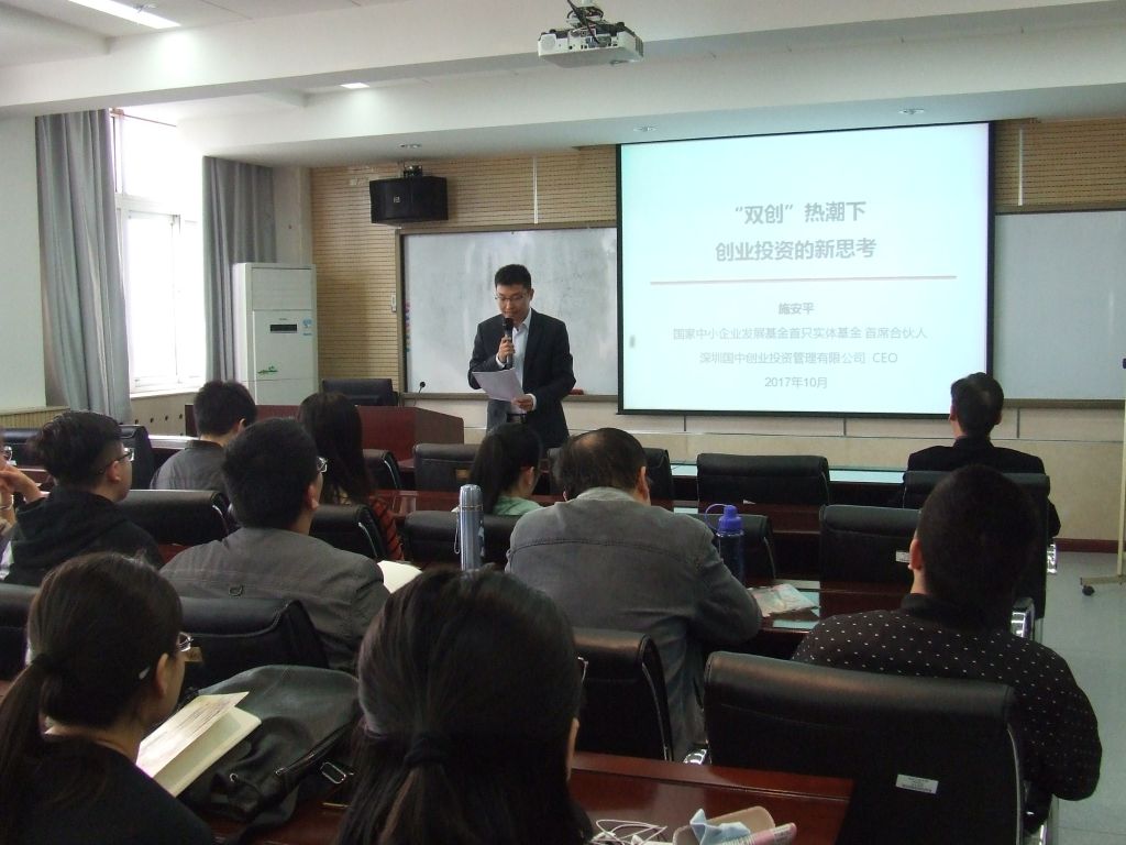 施安平教授从投资机构的角度,作了题为“‘双创’热潮下创业投资的新思考”的讲座。施教授的讲座主要分为“双创”的新形势、创业者与投资者的关系、“双创”热潮下对创业者的“冷”提示共三个部分。在“双创”的新形势部分,施教授既为我们描述了大众创业进入快速发展车道的发展趋势,也指出创业项目趋同化及创投环境复杂化的发展现状。在国家层面上,国家中小企业发展基金的创立,为“双创”发展提供了助推力。在“创业者与投资者的关系”部分,施教授形象指出两者间是“恋爱关系”,论述了投资者所看重的四个创业精神。在“双创热潮下对创业者的‘冷’提示”部分,施教授警示了近年来创业者群体存在的四种不良问题。
