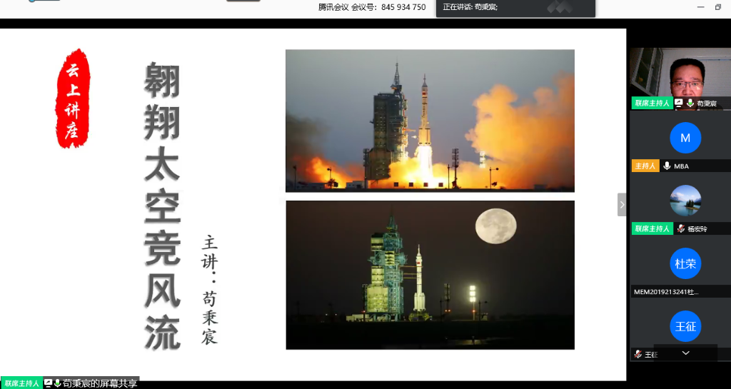 5月15日晚,我校机电学院苟秉宸教授受邀为我院专业学位研究生做了《翱翔太空竞风流---中国载人航天事业的亲历与思考》专题讲座。讲座由MBA/MEM教育中心主任杨宏玲主持,百余名学生通过腾讯会议软件在线聆听了讲座。