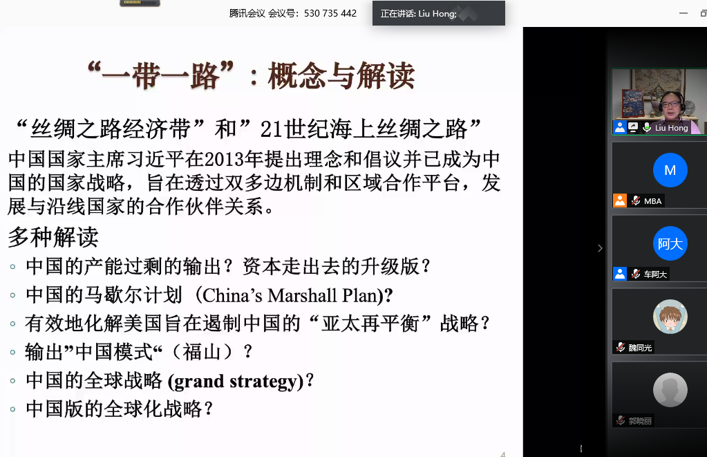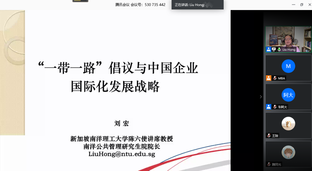 5月16日上午,我院特邀新加坡南洋理工大学公共政策与全球事务系陈六使讲席教授、南洋公共管理研究生院院长、中国教育部长江学者讲座教授刘宏带来第六场“云上讲座”——《“一带一路”倡议与中国企业国际化发展战略》。讲座由我院院长车阿大教授主持,近200位专业学位研究生通过腾讯会议聆听了讲座。