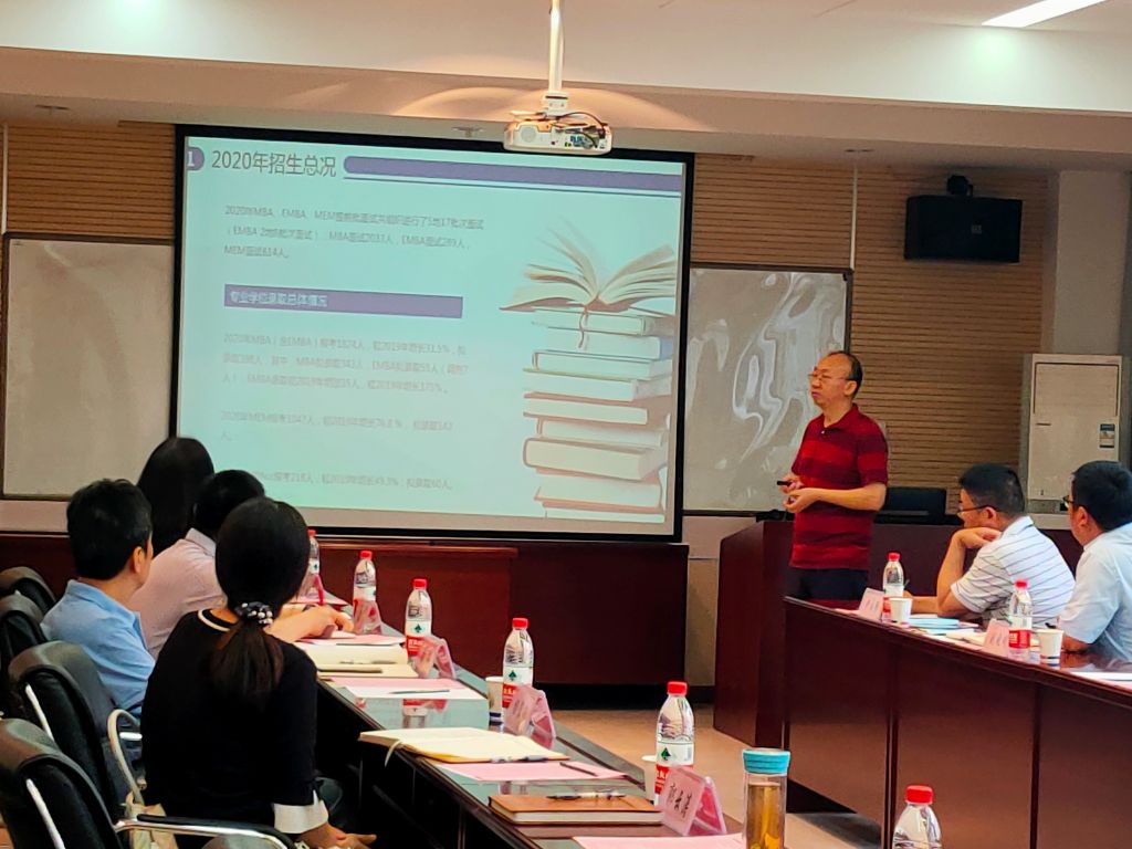 郭云涛副院长汇报了学院2020MBA(含EMBA)、MEMMPAcc的招生情况,并对招生数据进行了多维度分析。相关数据表明,我院2020年的生源质量等比往年都有所提高。随后,他介绍了2021年学院专业学位招生工作的计划及2021MBA(含EMBA)和MEM优秀学员选拔面试政策。