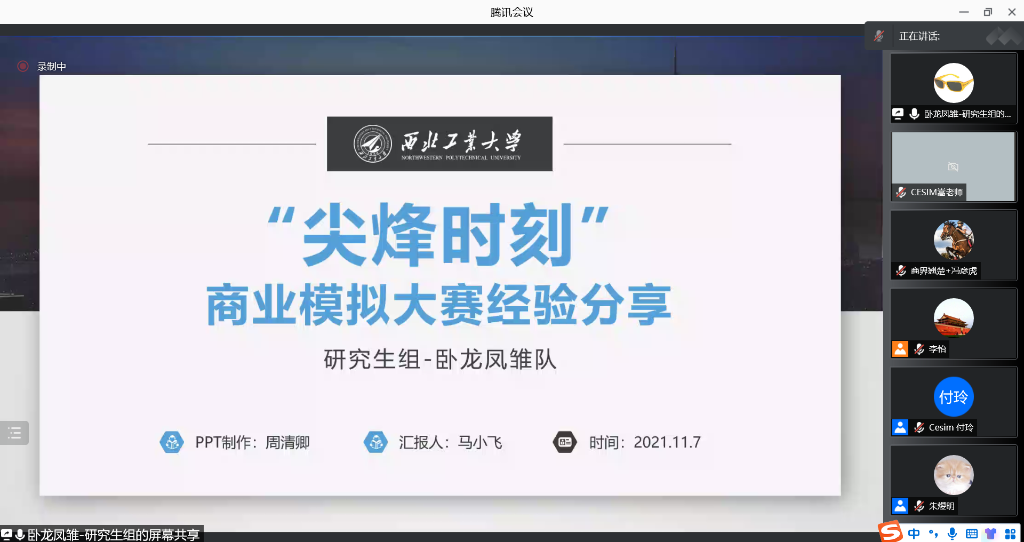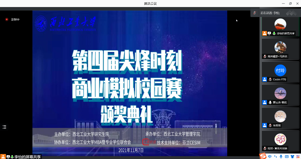 11月7日上午,第四届西北工业大学“尖烽时刻”商业模拟校园赛颁奖典礼在线上顺利举行。研究生院副院长汪焰恩,amjs澳金沙门副院长郭云涛,amjs澳金沙门教授朱煜明, Cesim中国西北服务中心负责人付玲和参赛选手参加了本次会议,会议由MBA/MEM教育中心学生工作主管李怡主持。
