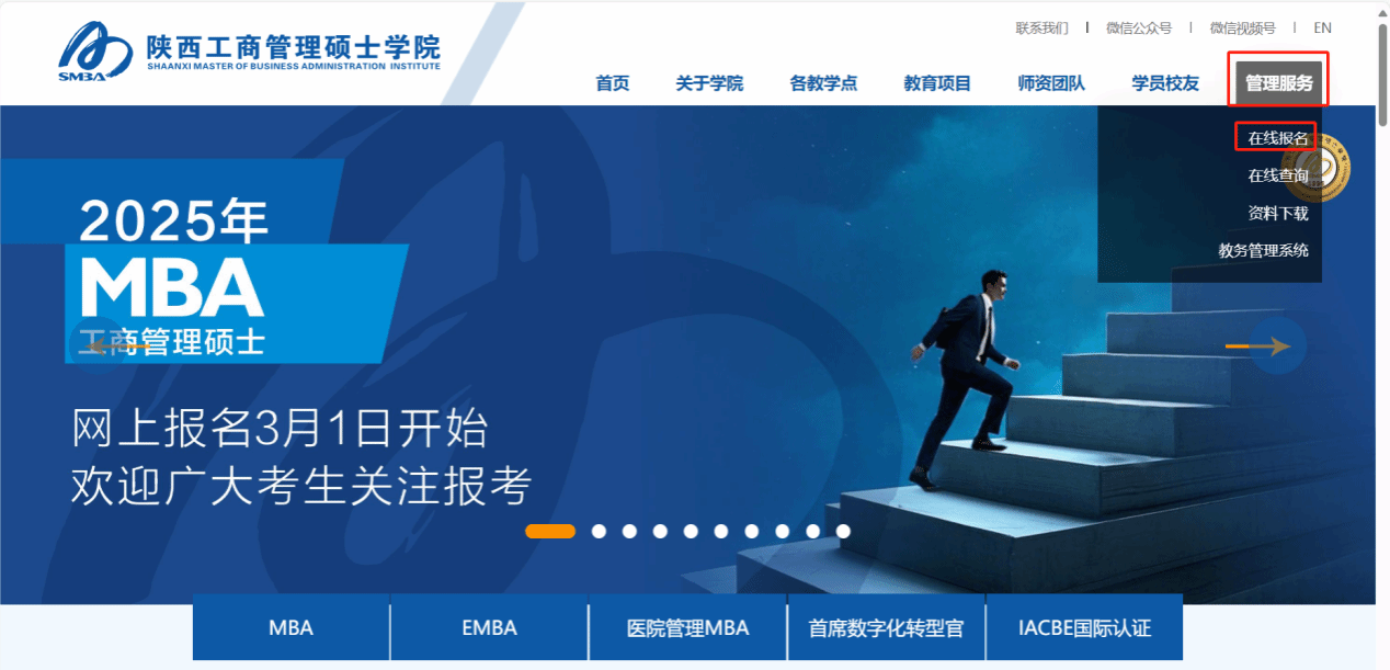 电脑、手机浏览器登录http://www.s-mba.com/,点击【管理服务】--【在线报名】