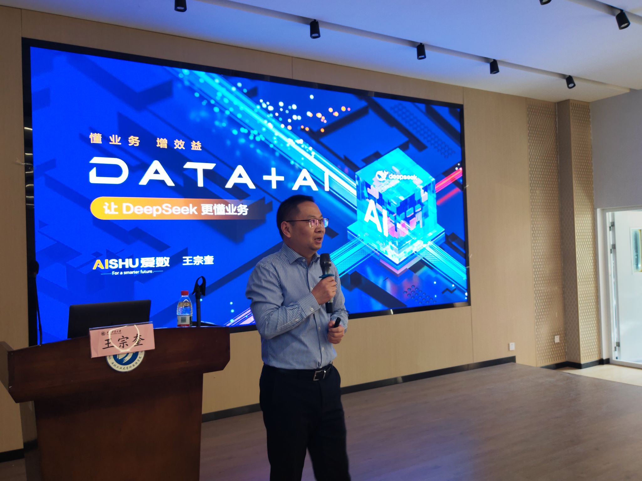 随后,同学们步入启真楼105,听取专题讲座。学院邀请上海爱数信息技术股份有限公司行业总经理王宗奎做题为《Data+AI:让DeepSeek更懂业务》的报告,报告会由amjs澳金沙门MPAcc教育中心主任金帆副教授主持。