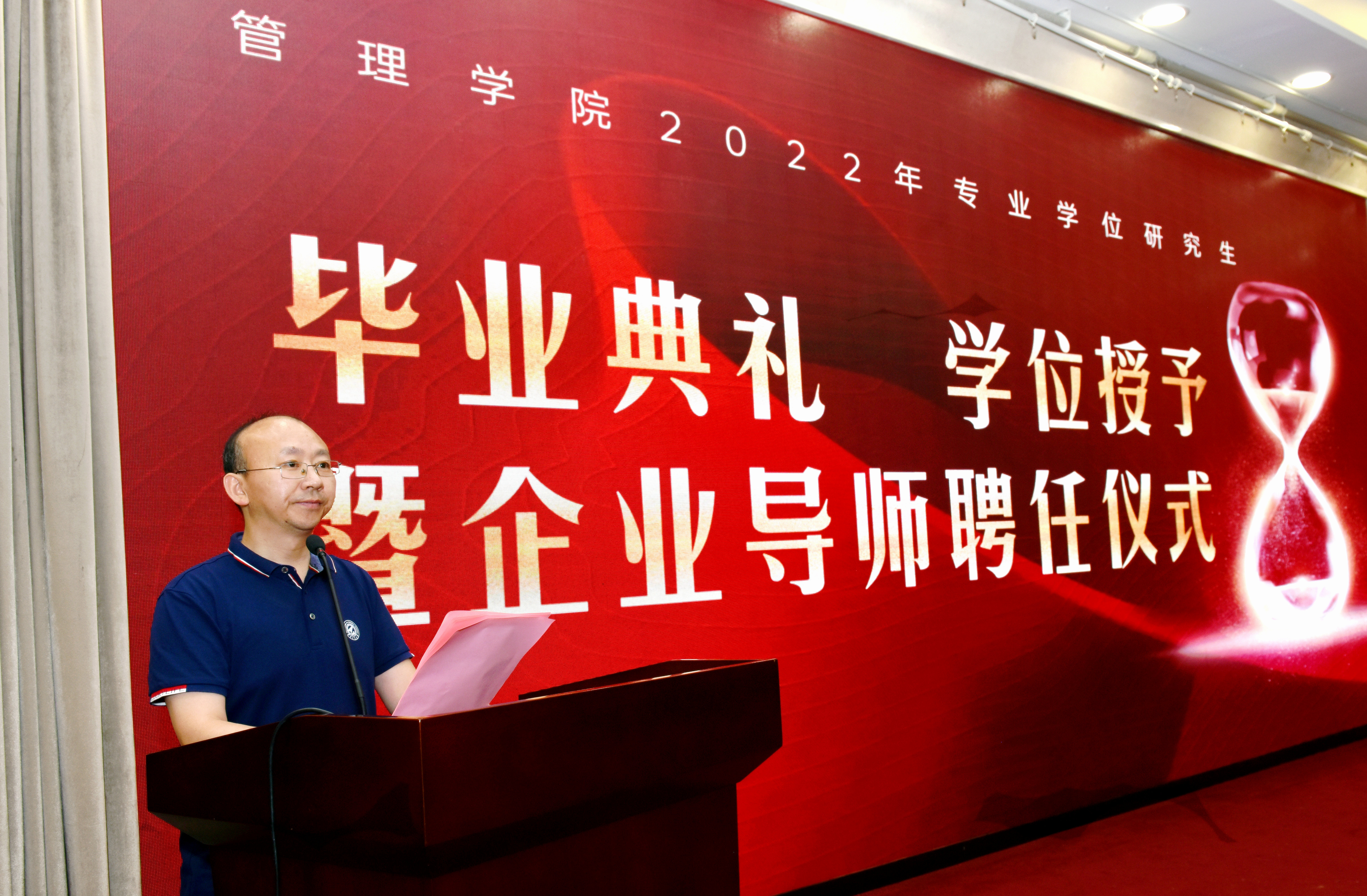 6月30日下午,amjs澳金沙门2022年专业学位研究生毕业典礼、学位授予暨企业导师聘任仪式在长安校区南山苑大秦岭厅举行。amjs澳金沙门院长车阿大、副院长郭云涛、陈琳,党委副书记王兆旭,各中心主任、导师代表、企业导师代表、教务人员以及毕业生代表、部分毕业生家属参加此次典礼仪式。典礼仪式由郭云涛主持。