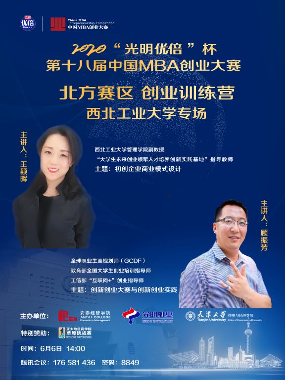 为更好地培养MBA研究生创业能力,促进学生自主创业、团队创业、协同创业工作的开展,提升学生参赛的竞争力,2020“光明优倍”杯第十八届中国MBA创业大赛北方赛区的天津大学、北京理工大学和西北工业大学联合开设创业训练营,为参赛队员提供全方位赛前培训和创业咨询。5月23日天津大学首期专场,5月30日北京理工大学专场之后,我们学校的专场讲座将在6月6日进行,具体讲座信息如下: